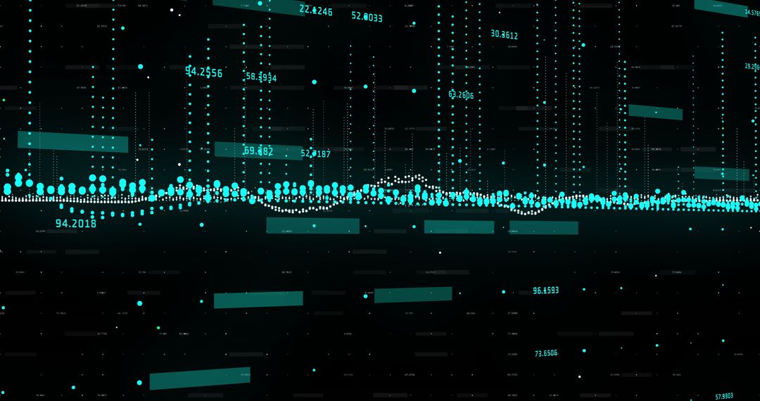 Teal dots and bars spread across dark background depict dynamic data analytics. Ideal for presentations, technology content, and digital marketing materials to accentuate modern interfaces and analytics themes.
