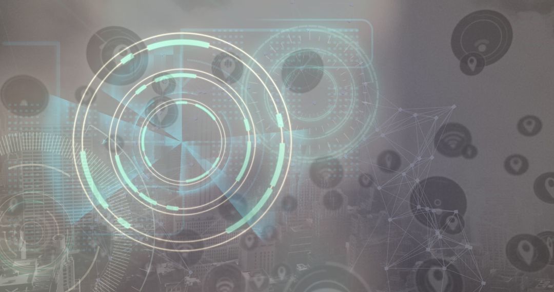 This image depicts a futuristic digital network with elements of data processing and global communication over a city's skyline. Key visual features include circular scopes and connection points, illustrating concepts of connectivity and technology's impact on urban environments. Ideal for use in articles, blogs, or presentations on smart cities, technological advancements, or digital networks.