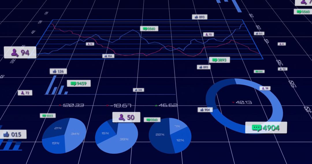 Image showcases a modern digital data dashboard with various interactive graphs including pie charts, a donut chart, and social media analytics icons on a grid-like plane. Ideal for illustrating articles or presentations on data analytics, business intelligence, technology trends, or user interaction driven by metrics.