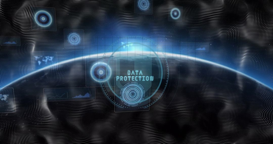 Digital representation of data protection and technology with planet horizon reveals advanced tech grid structure and virtual interface rings in space atmosphere. Ideal for technology blogs, sci-fi themes, data security content, and futuristic project visuals.