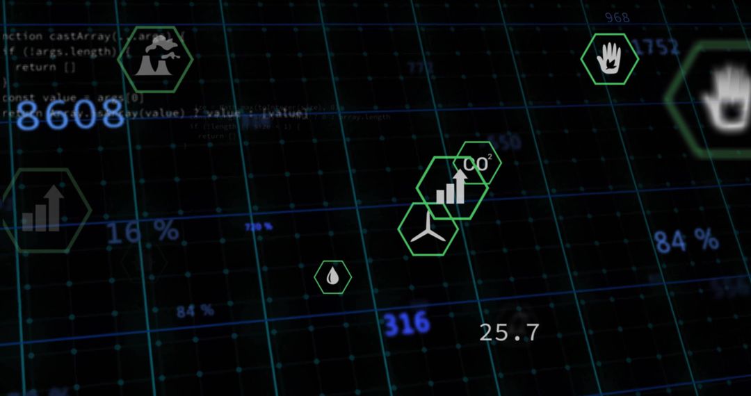 Visualizes futuristic digital themes with green hexagon icons over a complex grid filled with data metrics. Useful for illustrating advanced technology concepts, security systems, data analytics software demos, sci-fi technology depictions, simulation systems.