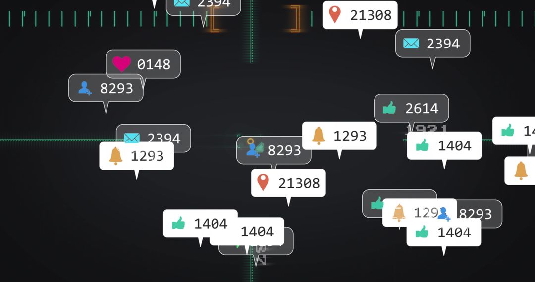 Visual displays number of notification types hovering over digital grid, catching essence of modern analytical technology. Suitable illustrating data management, user engagement analysis, real-time notifications. Ideal use for technology software promo and analyst workshops.