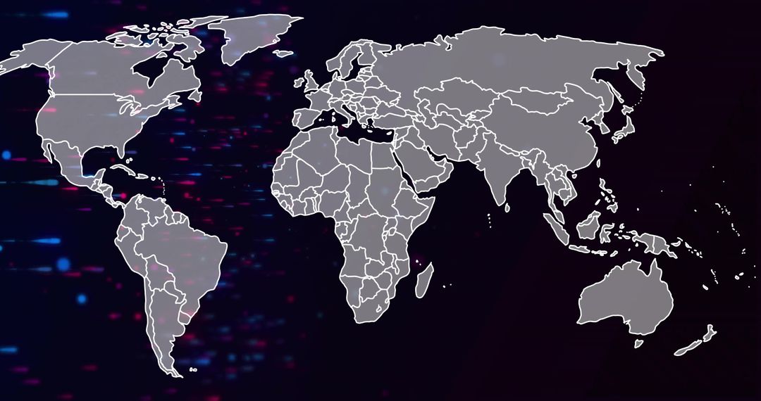 Illustrates a world map with gray continents and white borders on a dark background filled with dynamic red and blue particles. Suitable for themes related to global connectivity, cyber security, or advanced technology. Great for presentations, websites, and articles focusing on data science, internet security, and innovative interfaces.