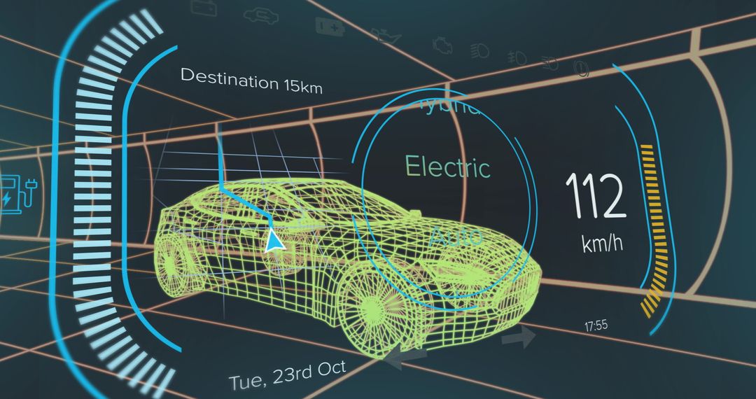 This exhibition of a high-tech dashboard interface for electric cars is ideal for presentations on modern automotive technology, sustainability efforts, and green energy innovations. Its visually appealing digital elements represent the future of eco-friendly transportation, suitable for marketing materials or education about advancements in the electric car industry and renewable energy sources.