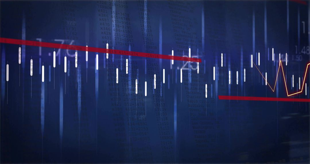 This visualization of white candlestick charts with red trendlines and an orange line graph against a dark blue background is ideal for presentations, financial reports, websites, or apps focused on market analysis, investment strategies, or economics.