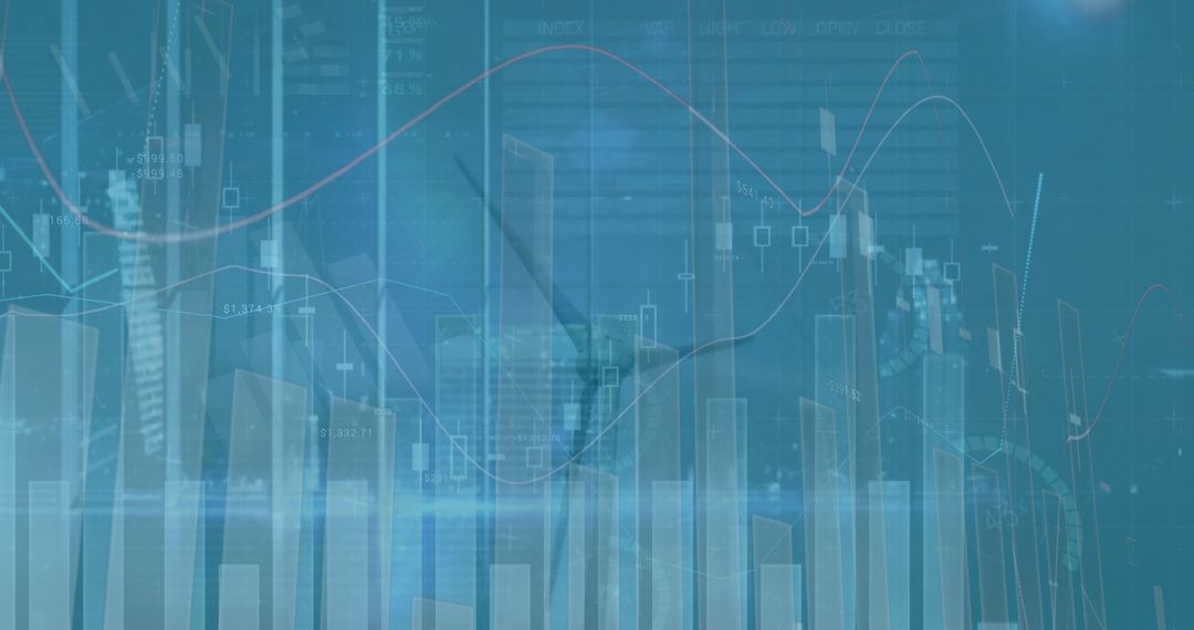 Translucent urban skyline floats within a digital grid featuring financial charts, creating a blended theme of finance and technology with a focus on renewable energy represented by the silhouette of a wind turbine. Ideal for use in presentations, articles about financial technology and renewable energy, or marketing for sustainability-focused businesses seeking innovative, forward-thinking imagery.