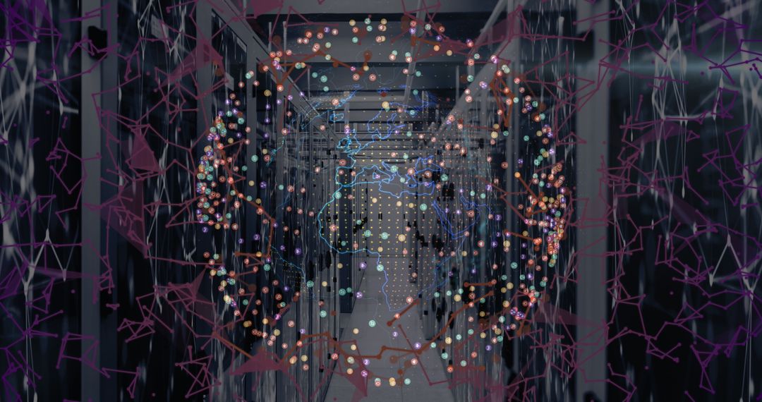 This visual represents the concept of global connectivity and digital advancement within a server room environment. The overlay of a globe surrounded by data points symbolizes the interconnectedness driven by technology. Useful for presentations on digital transformation, global business strategies, and innovation in technology.