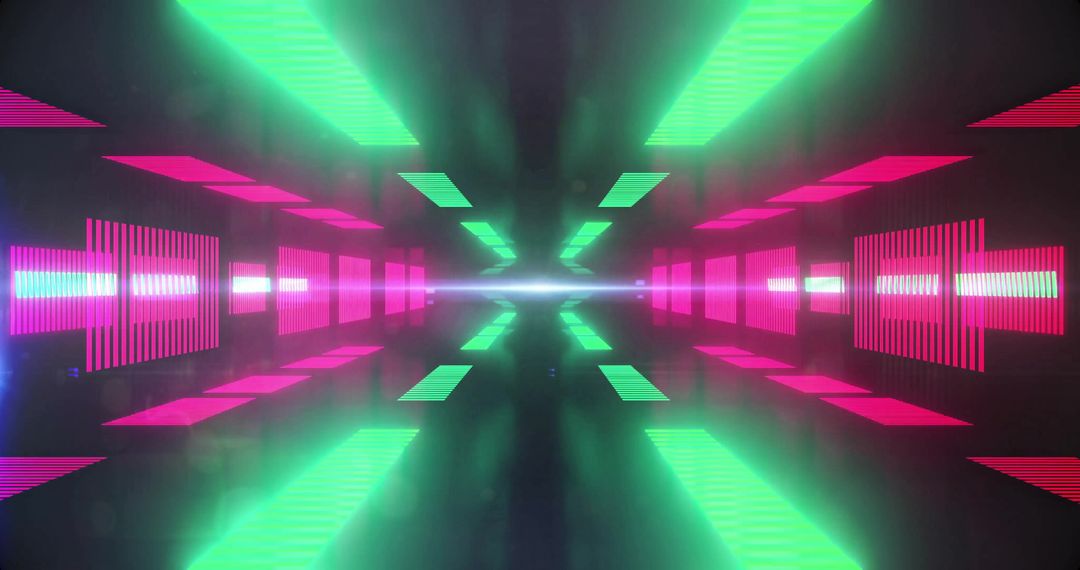 Vibrant and energetic neon pattern with pink and green glowing lines creating a symmetrical futuristic design. Ideal for digital and print backgrounds, technology abstracts, modern artwork, and event banners, adding a sense of energy and modernity.