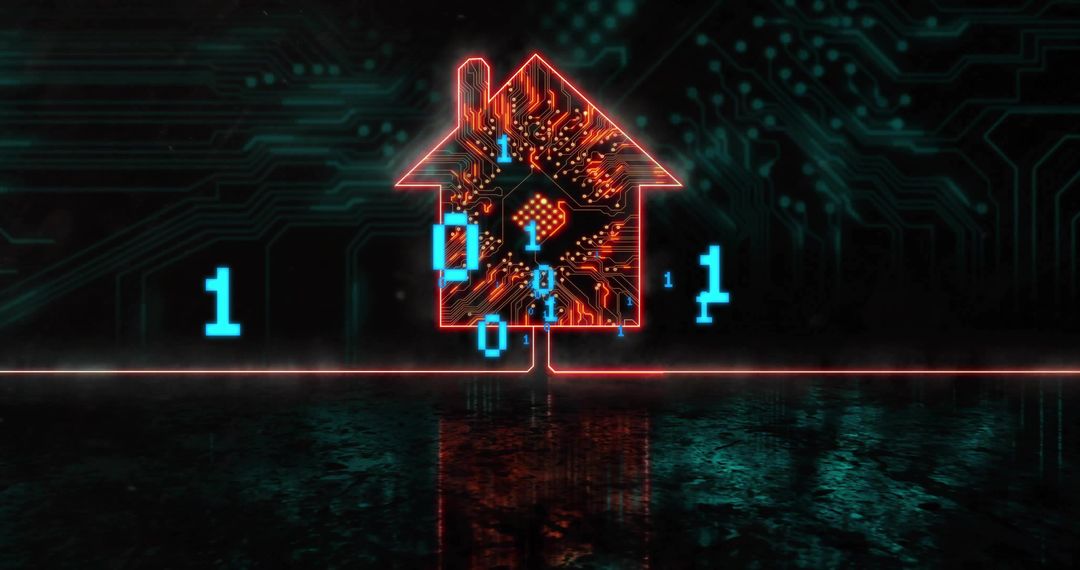 - Futuristic Home Technology Concept with Neon House and Binary Code