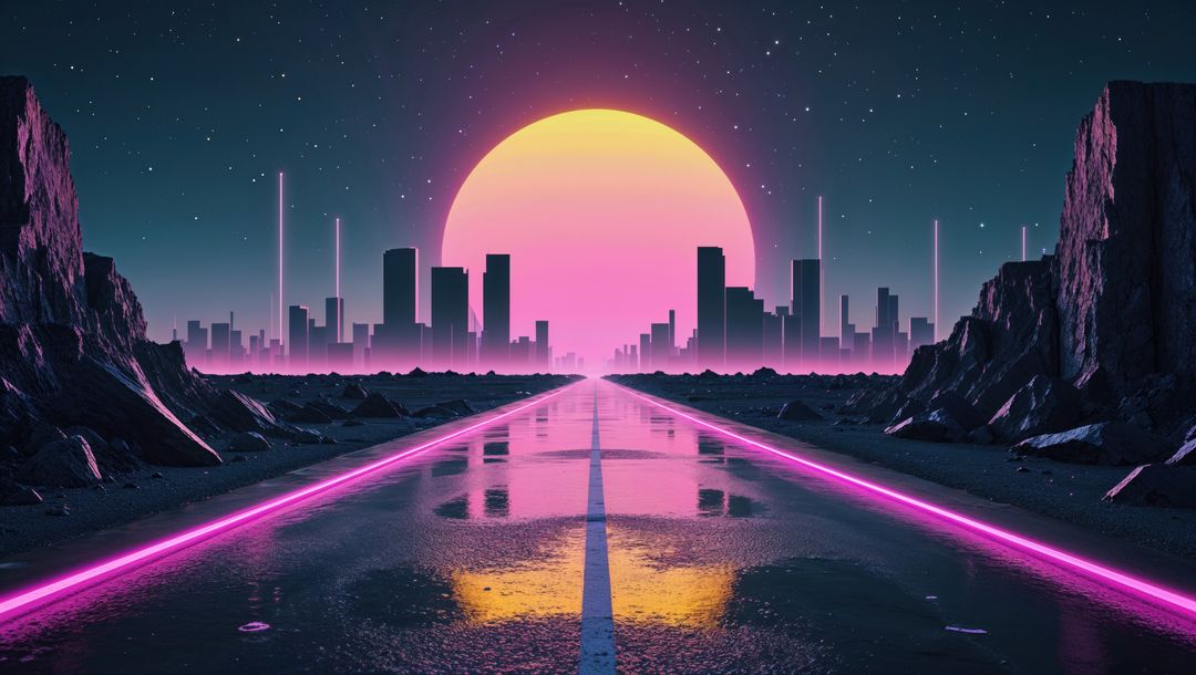 AI Generated Image. This depicts a luminous highway cutting through rocky terrain, lined with bright neon lights and leading towards a cityscape under a majestic pink sun and starry sky. Perfect for illustrating concepts related to future technology, imaginative worlds, cyberpunk themes, or digital landscape backgrounds. Ideal for use in sci-fi book covers, digital art showcases, or content focused on technology and innovation.