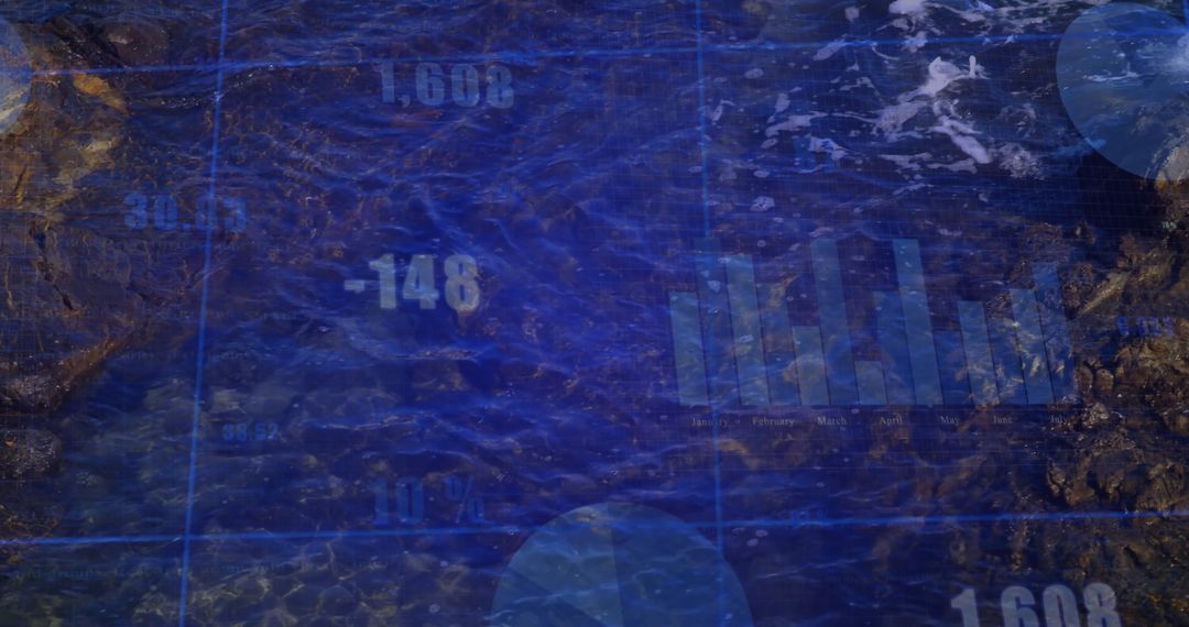 Digital graphic blending technology and ocean elements, featuring numeric overlays and charts visually representing data analytics. Suitable for use in presentations or projects related to marine industry, research or digital innovations.