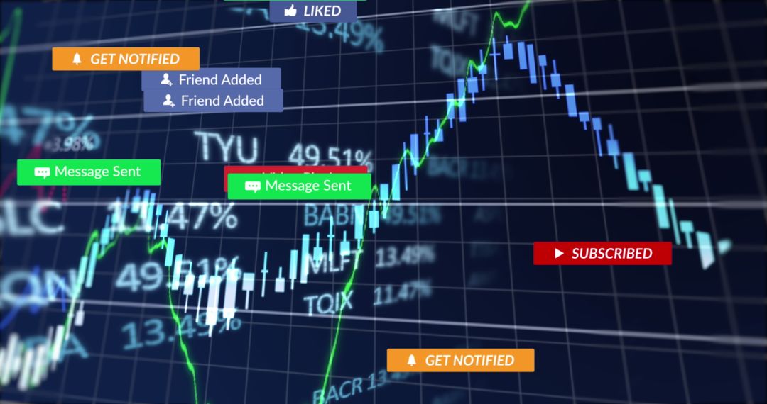 This graphic combines traditional stock market charts with social media notification elements, portraying a synergy between trading and digital interaction. Ideal for use in articles exploring the integration of social platforms in finance, educational materials about modern investment technologies, or presentations on the future of trading and social media influence.