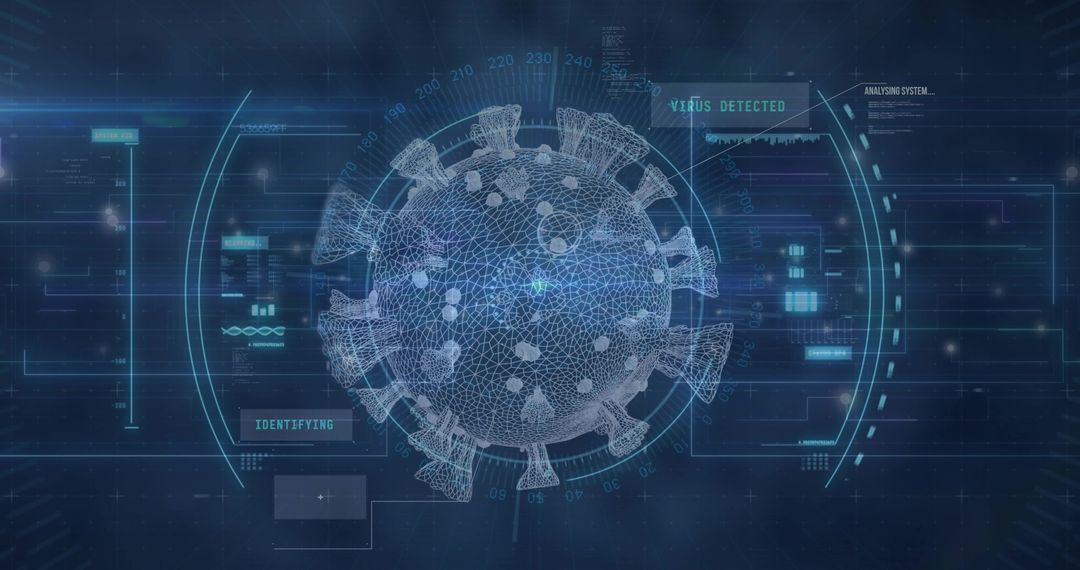 This visual showcases a 3D wireframe model of a virus centrally placed within a complex, futuristic digital interface with various HUD elements. Ideal for use in blogs or articles about biotechnology, antivirus technology, advancements in diagnostics, data analytics, or discussions on the role of technology in fighting pandemics. Great for educational materials that require visuals on cybersecurity and biotechnological innovation.