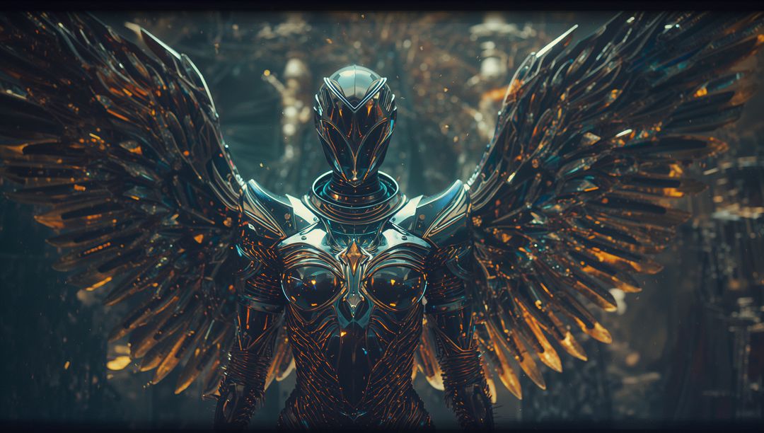 - Futuristic Winged Cybernetic Warrior in Glistening Armor