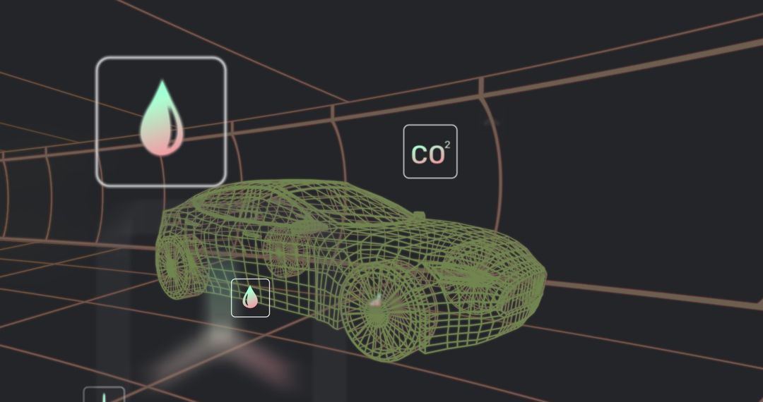 Wireframe model of a car surrounded by digital icons representing technology and environmental considerations, such as CO2 and eco-friendly features. This image can be used for articles or presentations focused on advanced automobile technology, sustainable practices in the automotive industry, future mobility solutions, or environmental impacts of vehicles.