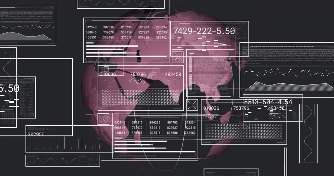 Visual depicting technological advancement with a stylized pink globe among data panels. Ideal for themes surrounding cybersecurity, modern analytics, and digital solutions. Suitable for illustrating concepts of global networking and data-driven innovation.