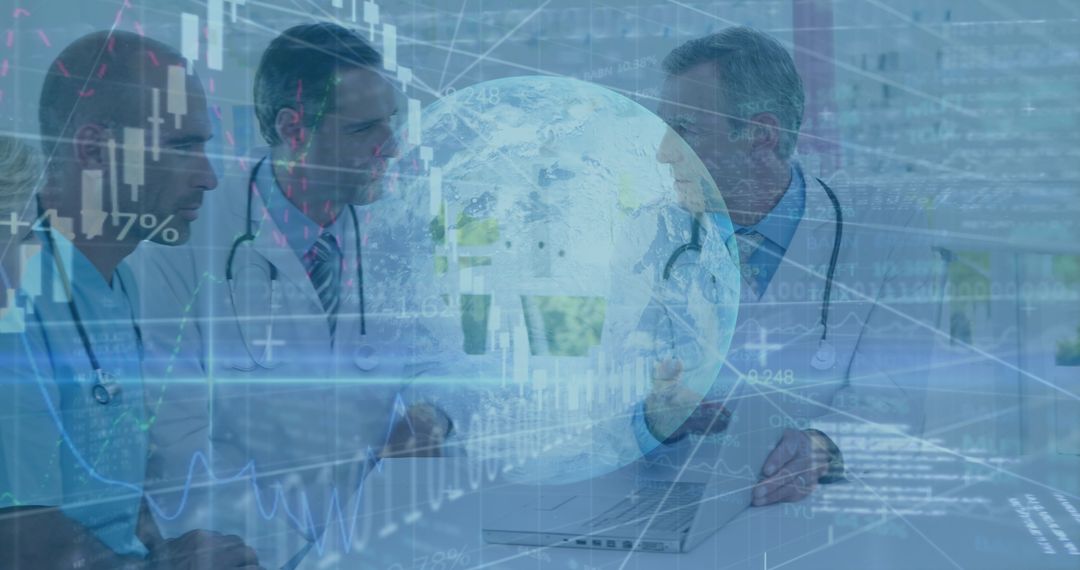 Image shows diverse group of doctors engaging in conversation, overlaid by digital financial graphs and a world globe. Represents intersection of healthcare, technological advancement, and global economy. Useful for illustrating concepts in medical technology startups, healthcare innovation conferences, or finance in medicine discussions.