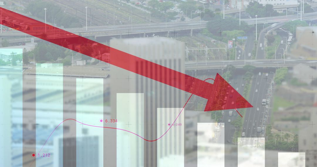 Overlaid red arrow points downward across a faded cityscape, symbolizing financial decline and economic challenges. Useful for articles on market analysis, financial downturns, economic forecasts, or technology in finance.