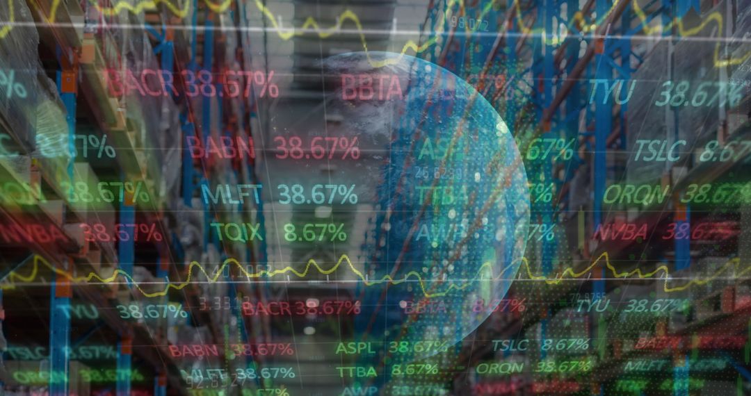 This image illustrates the integration of stock market data and global logistics, symbolizing the interconnectedness of finance and international trade. The combination of the globe and stock figures superimposed on a warehouse emphasizes modern business dynamics and challenges in supply chain management. Ideal for articles or marketing materials focused on global commerce, finance, investment strategies, and logistic operations.