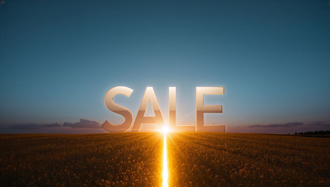 AI Generated Image. Glowing 3D SALE letters reflecting sunbeam across golden canola field at sunrise, creating dramatic backlit composition and long reflective light path toward horizon. Warm golden tones and crisp blue sky producing high-contrast, cinematic look. Ideal for retail and marketing uses: website banners, hero headers, social media ads, email campaigns, seasonal sale posters, billboard mockups, in-store signage. Providing ample negative space in sky for text overlay and flexible cropping for desktop and mobile layouts. Suggesting typography pairing: bold sans-serif for headline, thin condensed for subhead. Conveying themes of growth, harvest, optimism, high-value promotion. Including AI-generated label in metadata when required by platform.