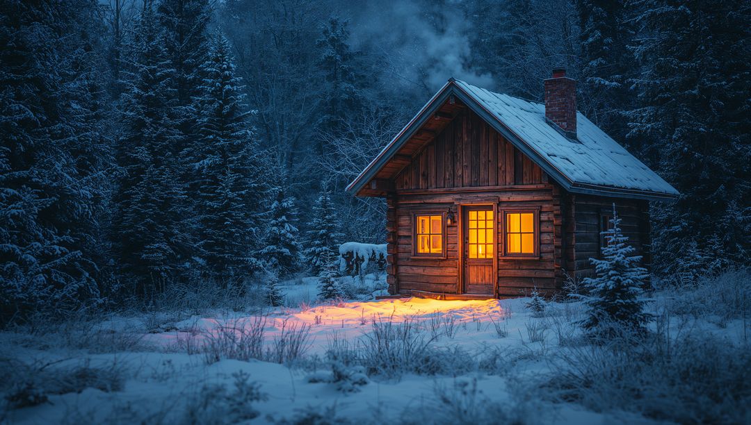 - Glowing log cabin casting warm light across snow-covered conifer forest clearing at night