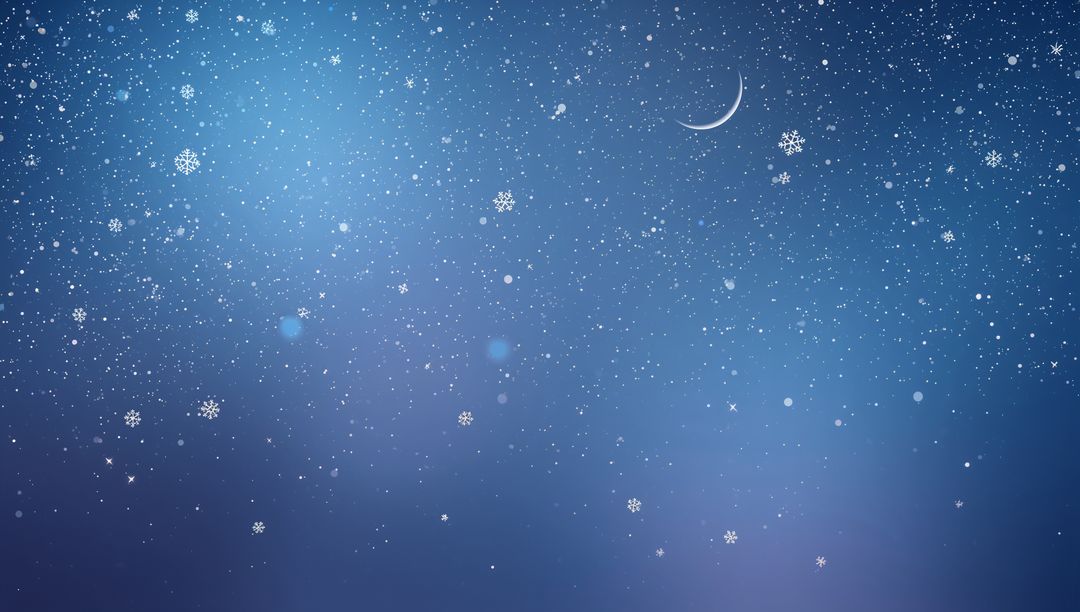 - Glowing Snowy Starry Night Sky Featuring Crescent Moon and Falling Snowflakes