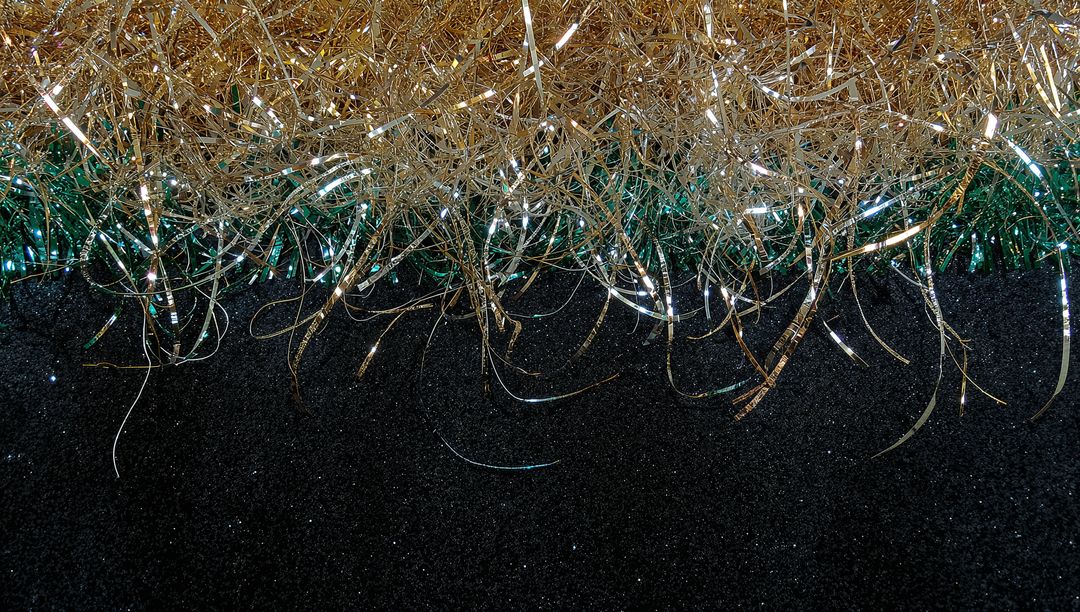 AI Generated Image. Glittering gold and green tinsel strands shimmering over dark glitter surface, featuring silver filaments catching studio light. Close-up composition highlighting metallic texture and high contrast between bright strands and deep background. Ideal for holiday and celebration visuals, including banner, website hero, social media header, greeting card, event flyer, product packaging, retail promotion. Suitable for Christmas, New Year, party, craft, DIY project, seasonal advertising. Provide multiple crop options and color grading flexibility for brand customization and layered design.