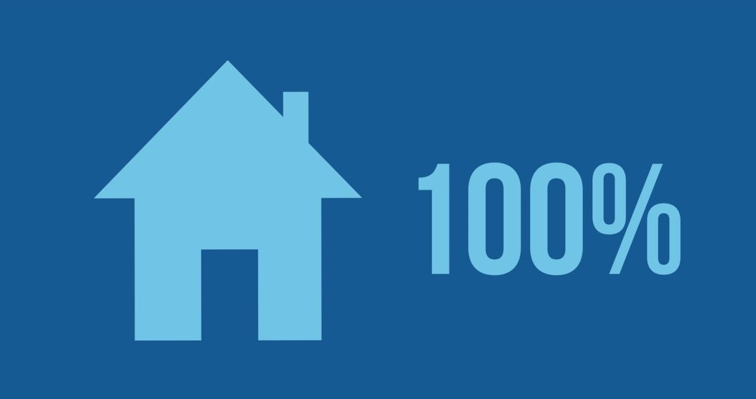 Image shows a house silhouette next to 100 percent sign on dark blue background, indicating concepts of homeownership, achieving full investment in real estate or paying off a mortgage. Useful for financial institutions, real estate agencies, or homebuyer resources illustrating completion in a bold, visual way. Perfect for presentations emphasizing property ownership success or marketing campaigns targeting homebuyers.