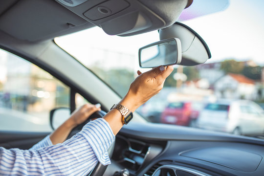 - Hands Adjusting Rearview Mirror in Sunlit Car Interior Setting