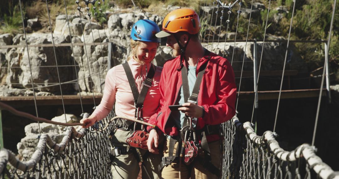 Couple clad in helmets and safety gear stand on a rope bridge perched in a scenic mountain environment. They are actively engaged with a smartphone, possibly navigating a trail or sharing entertaining moments. The setting is perfect for promoting adventure tourism, travel technologies, and activities focused on connection with nature. Ideal for use in campaigns related to outdoor exploration or couple’s outdoor activities.