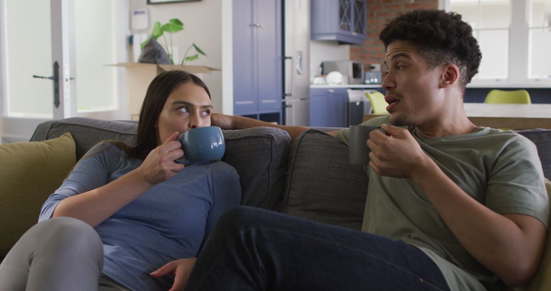 A biracial couple is drinking coffee and conversing in a modern living room setting. Both exhibit relaxed, happy expressions while enjoying their time together. This image is ideal for articles on relationships, marketing coffee products, or illustrating lifestyle content focused on home interiors and cozy family activities.