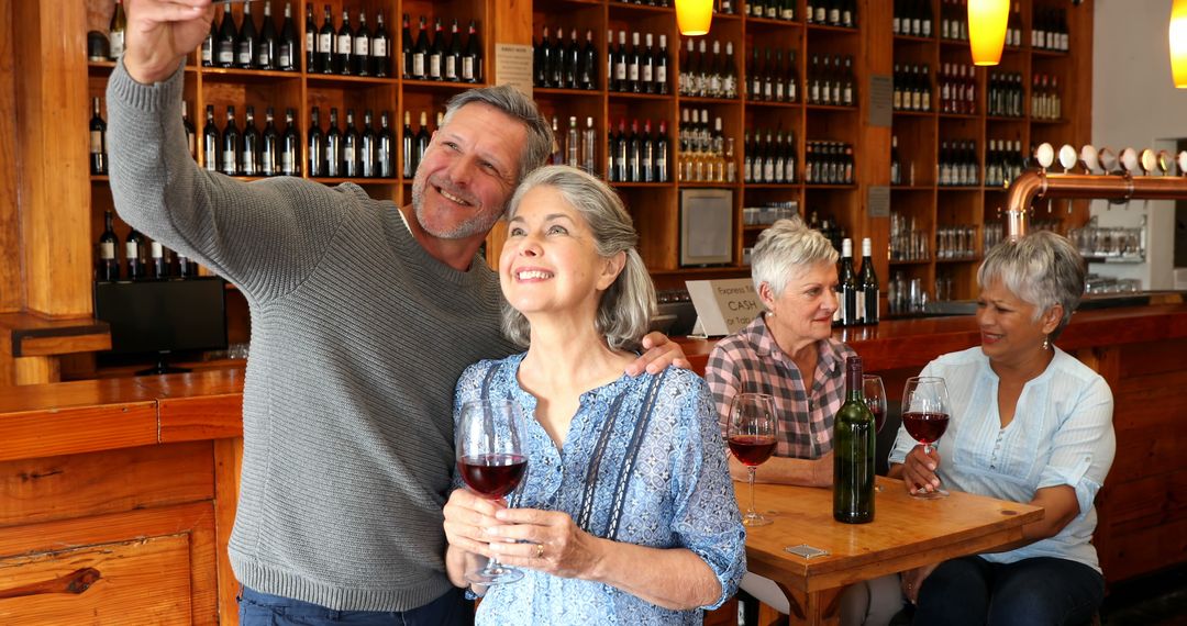 Middle-aged couple capturing moment with selfie in a cozy wine bar. Behind them, two women converse, adding to the lively atmosphere. Great for use in articles about social outings, wine culture, leisure activities, and vibrant lifestyle imagery.