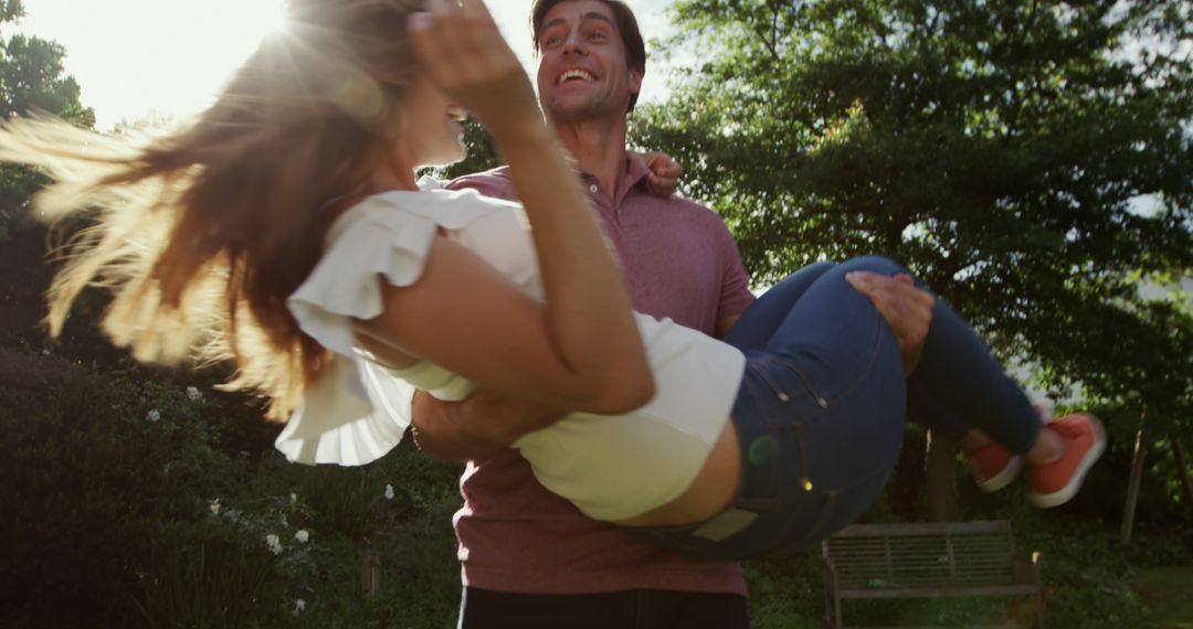 - Happy Couple Joyfully Embracing in Sunny Garden