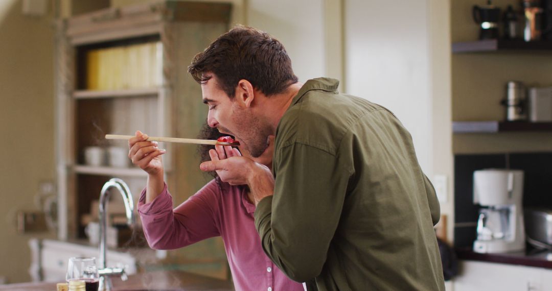 A joyful scene of a couple sharing love for cooking in cozy kitchen environment, enjoying each other's company and tasting their culinary creation. Perfect for use in advertising family-oriented cooking classes, articles on strengthening relationships through joint activities, and lifestyle blogs focusing on home cooking and relationship building.