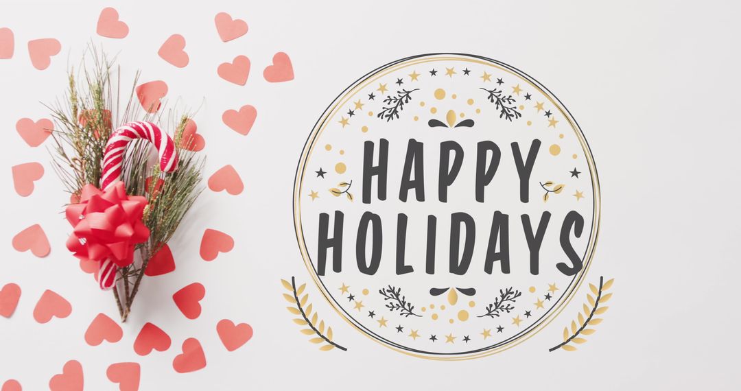 Colorful design featuring 'Happy Holidays' text alongside pine branches, a red candy cane, and scattered hearts, creates a festive atmosphere perfect for holiday greeting cards, seasonal newsletters, or digital invitations. Ideal for businesses and individuals looking to spread holiday cheer with a warm and inviting design.