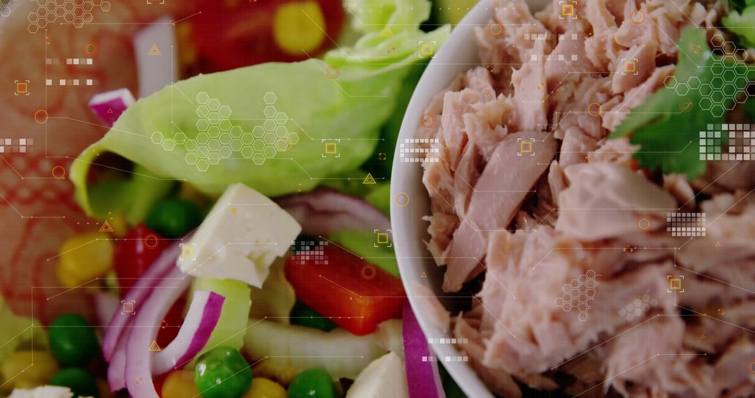 Close-up view of a fresh salad bowl containing tuna flakes, crisp lettuce, red onions, cheese cubes, and mixed vegetables. Digital overlay adds a modern touch, illustrating precision in culinary arts. Ideal for health-related content like recipe blogs, nutritional guides, or cooking magazines. Perfect for showcasing healthy eating lifestyle, presenting a fusion of fresh produce and digital design.
