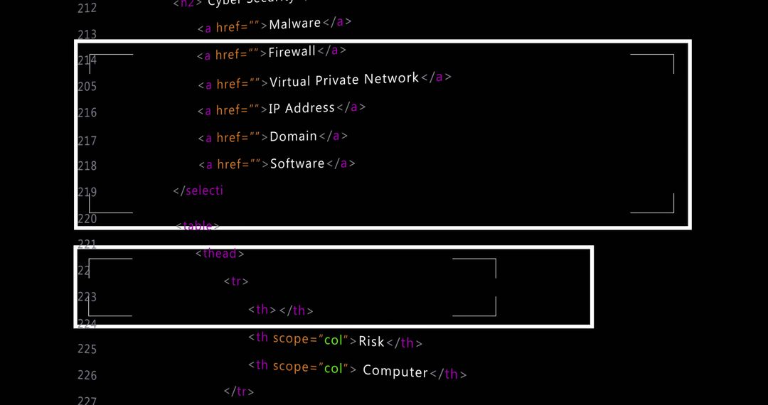 This illustration showcases HTML code directed towards a select menu and table headers within a programming interface using a dark theme. The code includes common elements like links related to cybersecurity terms (E.G., Malware, Firewall, VPN). Useful for illustrating design approaches for software development tutorials, cybersecurity education, and coding exercises demonstrated in programming workshops.