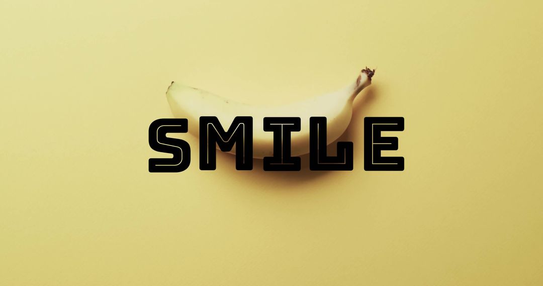 This composition of a banana with the word 'SMILE' in bold emphasizes positivity and health. The vibrant yellow background signifies energy and happiness, perfect for vegan food promotions or wellness lifestyle marketing. Suitable for bloggers or advertisers focusing on cheerful and fresh content.