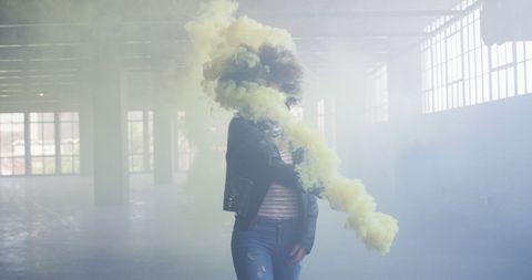 Young man walking through an empty warehouse with blue smoke trailing behind him, creating an edgy and rebellious atmosphere. The scene captures an urban and gritty vibe, possibly symbolizing independence or artistic expression. Perfect for use in promotional materials for clothing brands, music album covers, or events seeking to convey an urban or rebellious feel.