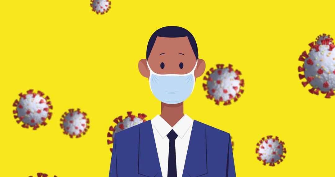 Illustration depicting a man in formal attire wearing a face mask, with coronavirus particles in the background on a bright yellow backdrop. Image can be used for materials promoting public health guidelines, awareness campaigns on social distancing and protective measures during the pandemic.