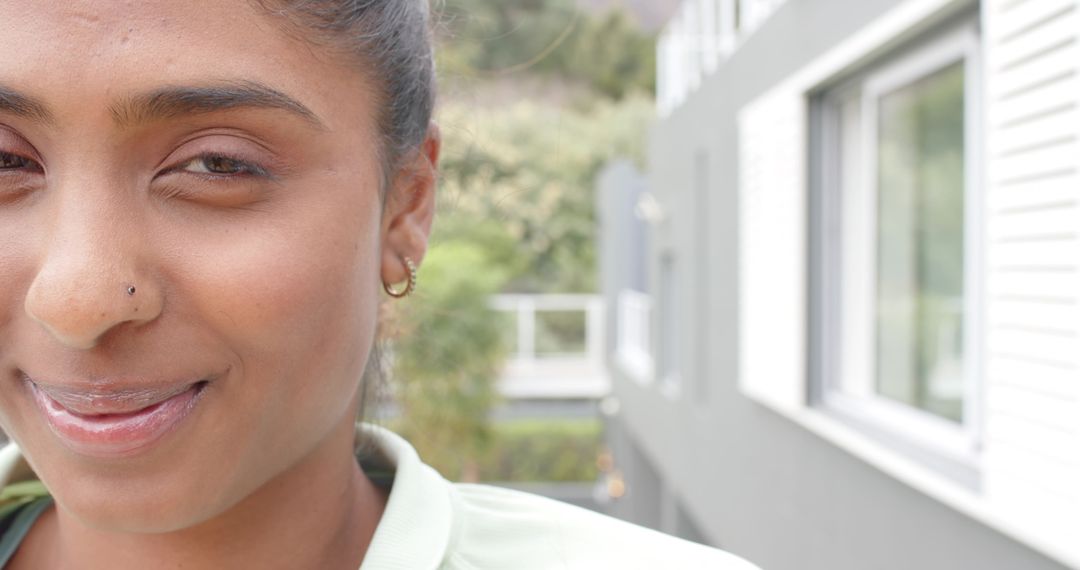Portrait showing Indian woman smiling on balcony with nose stud and hoop earring, soft natural light and blurred greenery in background. Featuring close-up left-side crop leaving ample copy space on right for headlines, logos, or text overlay. Skin tones appearing natural, expression conveying calm confidence and approachability. Featuring shallow depth of field and diffused lighting for gentle, flattering mood. Working well for lifestyle and beauty campaigns, multicultural marketing, social media profiles, mental health and wellness content, jewelry promotion, headshot use, editorial features, and website hero banners. Serving well for advertising layouts, brochure covers, blog headers, profile imagery, and product catalogs where contemporary urban vibe and personal connection are desired.