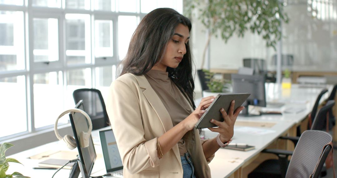 - Indian woman using tablet in modern open-plan office, professional casual business style
