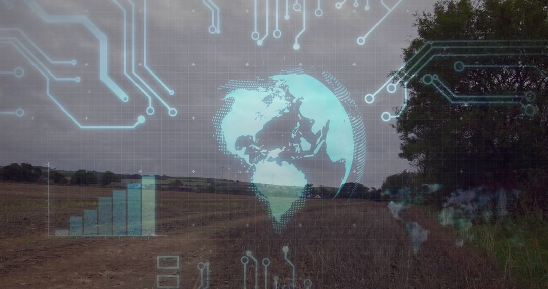 Depicting the integration of technology in agriculture, this visual features a glowing holographic Earth overlay on a plowed field, accented with circuit traces and a bar chart symbolizing data and analytics. Useful for illustrating the merging of tech and farming, emphasizing themes of innovation, sustainability, and the future of rural practices.