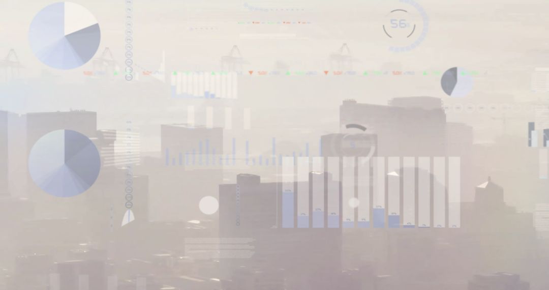 Visual showing a technological overlap of financial data visualizations above a faint city skyline. Symbolizes innovative approaches in global finance and data processing. Perfect for illustrating themes in high-tech financial solutions, global business trends, or data-driven urban development strategies.