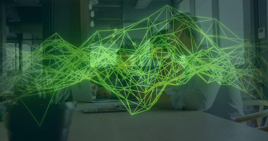 Dynamic green geometric web illustration superimposed over professionals collaborating at an office table creates a vibrant representation of digital networking and modernized teamwork. Useful for illustrating topics related to business innovation, technological connectivity, or teamwork in presentations or articles.