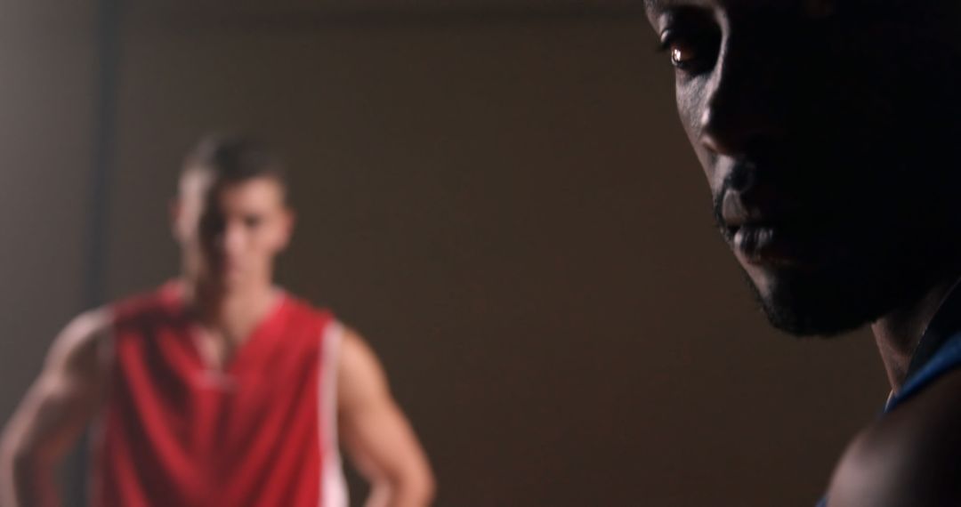 Two athletes preparing for a competitive basketball match capture the essence of focus and determination. Suitable for use in sports campaigns, motivational materials, or illustrating themes of teamwork and perseverance.