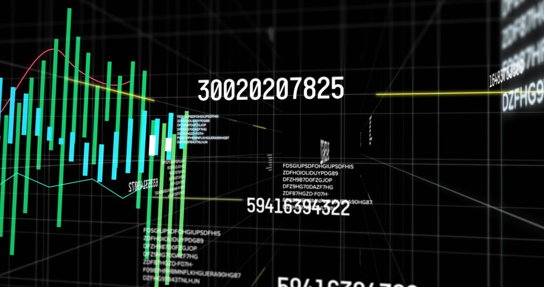 This graphic illustrates an interactive 3D grid with bar graphs and a numeric overlay, highlighting data visualization in digital analytics. Green bars alongside multicolor line plots symbolize advancements in technology. Ideal for presentations on big data analysis, digital innovation, or virtual reality in information processing contexts.