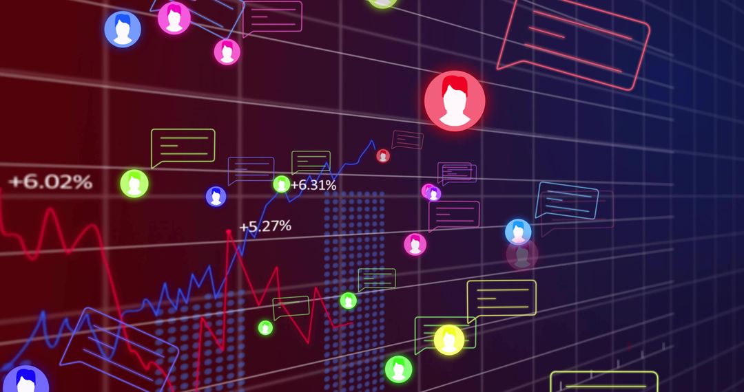 Futuristic digital display showing interactive elements like virtual avatars, chat bubbles, percentage labels, and analytical trend lines against grid. Bright neon colors enhance the technological theme, emphasizing digital communication and data analysis in modern dashboards. This is suitable for depicting conceptual themes in technology, digital environments, tech presentations, or innovative data analysis projects.