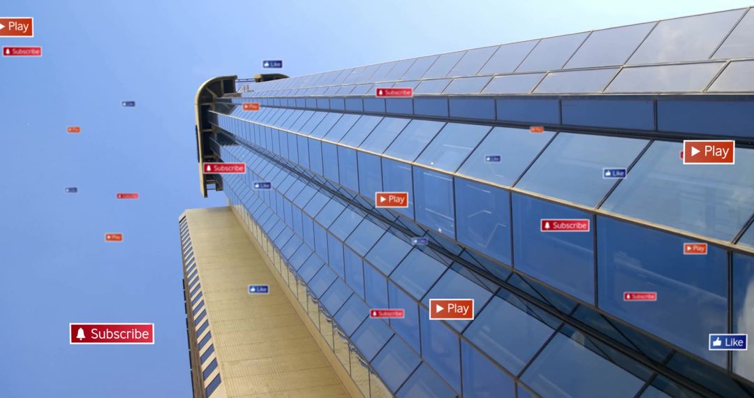 Glass skyscraper displays digital play and subscribe icons on surface. Perfect for illustrating blend of urban architecture with technology, social media themes, or modern user interaction concepts.