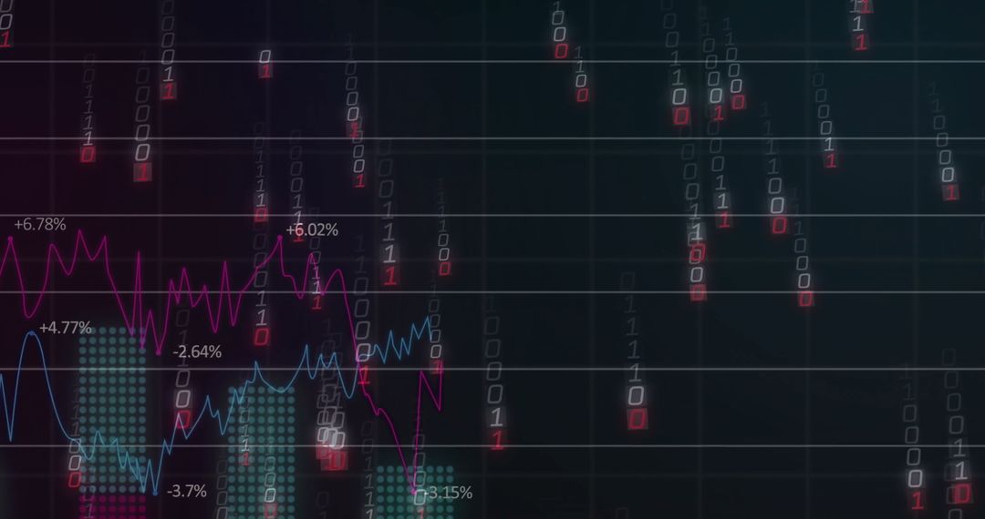 Dynamic data visualization capturing market trends with line and bar charts alongside binary digits, represents technical analysis and real-time analytics. Useful for finance-related platforms, digital analytics teaching, presentations on investment strategies.